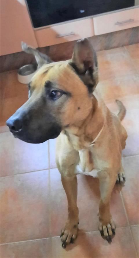 Roy wurde im Sommer 2020 in Cartagena, einer Großstadt im Südosten Spaniens, streunend auf der Straße aufgegriffen. Um den Hals war ein Strick gebunden, er war am Ende seiner Kräfte und befand sich ganz offensichtlich in größter Not. Sein Retter, der den interessanten Mischling aus Malinois und Boxer gerne behalten wollte, bat die Tierschützerin Ute Kaiser um Hilfe.